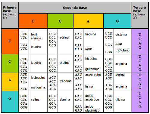 Las reglas por las que la secuencia de nucleótidos de un determinado gen se traduce finalmente en la secuencia de aminoácidos de una proteína.