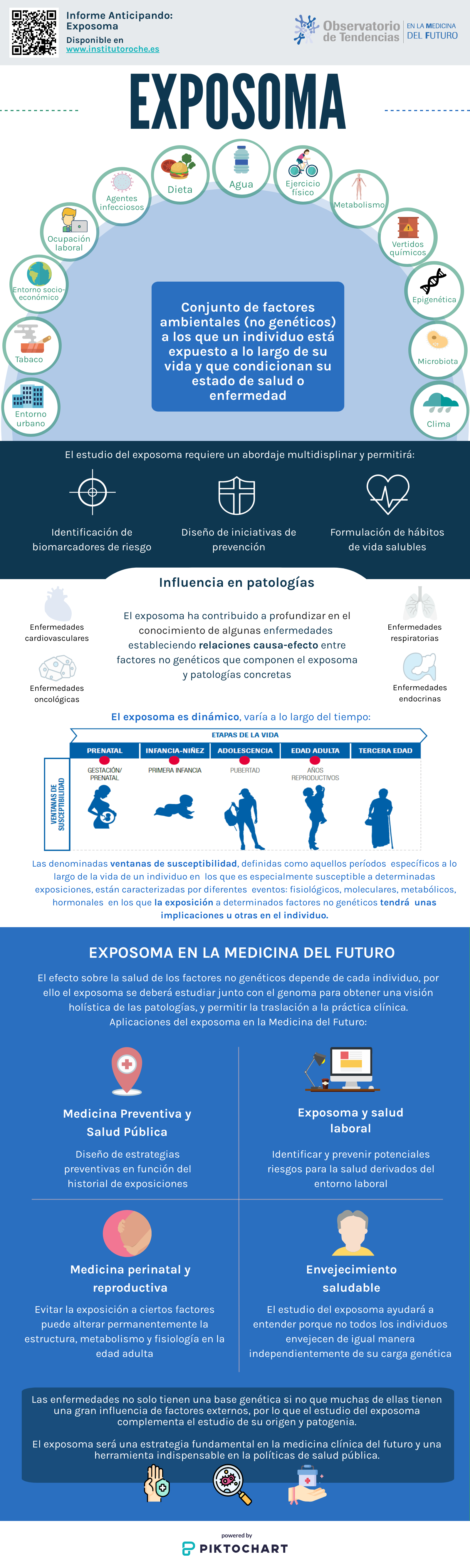 Con el objetivo de identificar y estudiar los elementos que componen el entorno, surgió el concepto del exposoma, definido como todos aquellos factores no genéticos a los que un individuo está expuesto a lo largo de toda su vida y que condicionan el estado de salud o enfermedad. Algunos factores que se incluyen dentro de esta categoría son los contaminantes ambientales, el ámbito socioeconómico, el entorno urbano, los agentes infecciosos o el de estilo de vida de cada individuo.